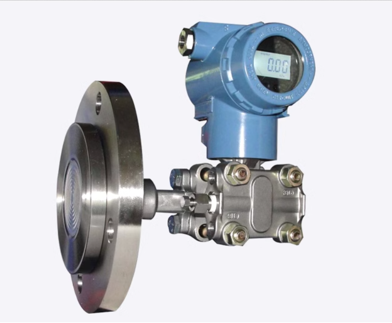 雙法蘭式液位變送器比較特殊, 由正負兩個感壓膜片組成, 各通過一段密封內充硅油的毛細引壓管與表的正負壓室連接。 安裝后, 連接負引壓管的法蘭升高, 其內的硅油就對負壓室產生了壓強。